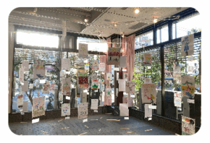 「リレー絵画」成果展が本郷図書館で巡回展示されています。